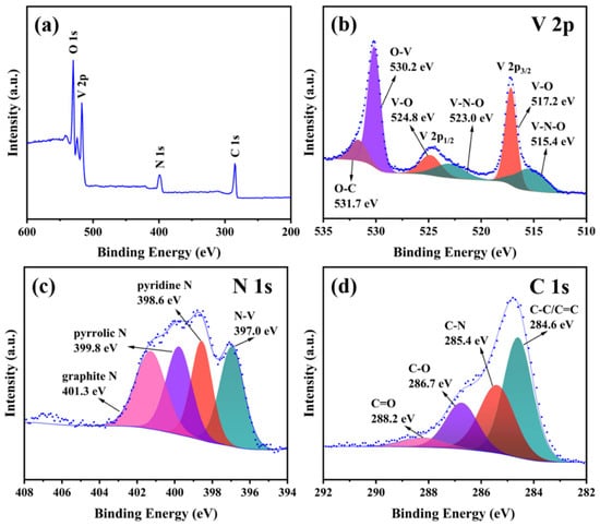 Figure 4 is the XPS diagram of VN/CNF. Figure 4a illustrates the presence of C, N, O, and V elements in the prepared VN/CNF. Figure 4b illustrates the presence of two distinct sub-peaks in the V 2p3/2 spectrum. These sub-peaks, observed at 515.4 and 517.2 eV, are attributed to V-N-O and V-O bonds, respectively [34]. Correspondingly, there are two peaks of V 2p1/2 peaks at 523.0 and 524.8 eV. The two peaks at 530.2 and 531.7 eV are related to the O-V bond and O-C bond. This shows that some oxidation occurs in nitride. The peak values of 397.0, 398.6, 399.8, and 401.3 eV correspond to N 1s, pyridine nitrogen, pyrine nitrogen, and graphite nitrogen (Figure 4c) of N 1s. The peaks at 284.6, 285.4, 286.7, and 288.2 eV, as shown in Figure 4d, are attributed to the C-C/C=C, C-N, C-O, and C=O bonds of the C 1s spectrum. XPS proves the generation of VN, which is combined with carbon fiber through the price bond.