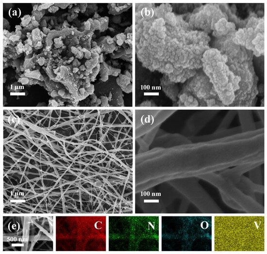The morphology and microstructure of the VN/CNF composite and the pure VN material were identified through the use of scanning electron microscopy (SEM) and transmission electron microscopy (TEM) (Figure 5 and Figure 6). From the SEM images of VN at different magnifications, it is obvious that VN agglomeration is serious and that the particle size is different. VN/CNF has a fibrous interlaced mesh structure, with the coupling of VN quantum dots (Figure 5c). Compared with VN powders with severe agglomeration, VN/CNF with an interwoven three-dimensional network has a higher specific surface area. This structure is conducive to the wetting of the electrolyte, which is expected to improve the electrochemical performance of the electrode material. After further magnification, it can be seen that the surface of a single fiber is not smooth, which may be due to the morphological changes caused by the nitriding of the V element in the raw material, which is attached to the surface of the carbon fiber (Figure 5d). Figure 5e shows the HAADF image of the composite material and the corresponding element distribution diagram. The distribution of the C, N, O and V elements is observable, occurring in a uniform manner on the surface of the carbon fiber. This result is also consistent with previous detection results.