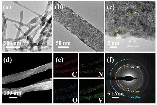 Figure 6 shows the transmission image of VN/CNF. As can be seen from the figure, the surface of the fibrous sample presents an uneven state. The high-resolution transmission map further shows that many VN quantum dots are uniformly clustered on the surface of the carbon fiber (Figure 6b). In Figure 6c, the VN particles are marked with the yellow circles. Meanwhile, the 0.21 nm lattice spacing of the carbon fiber edge corresponds to the (200) crystal face of VN (Figure 6c). Furthermore, the HAADF diagram of VN/CNF and the corresponding mapping diagram of the C, N, O and V elements can be employed to illustrate the uniform distribution of the aforementioned elements in the VN/CNF (Figure 6d,e). The diffraction ring of the SAED image in Figure 6f correlates with the (111), (200), and (220) planes of VN.