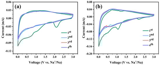 The electrochemical properties of VN/CNF and VN as SIB-negative materials are assessed by buckle batteries. Figure 7 illustrates the cyclic voltammetry curve of the VN/CNF and VN electrodes at a scanning speed of 0.1 mV s−1 and 0.2 mV s−1, respectively. In the initial cycle, three cathodic peaks are observed at 2.10, 1.06 and 0.7 V, which are not present in subsequent cycles. These peaks correspond to the formation of the solid electrolyte interface (SEI) film. The highly coincident CV curves from the second cycle indicate that the VN/CNF electrode exhibits remarkable electrochemical reversibility. In Figure 7b, there are also three sharp cathodic peaks at 2.17, 1.06 and 0.5 V, which indicates the formation of an SEI film. The coincidence of the subsequent cycle is worse than that for VN/CNF. The impedance data of VN/CNF and VN in the initial state were, respectively, tested (Figure S3). In the equivalent circuit shown in Figure S3, the symbols R1, R2, CPE and W are used to represent the solution impedance, charge transfer impedance, non-ideal double-layer capacitance and diffusion impedance, respectively. As illustrated in Figure S3, the charge transfer impedances of the VN/CNF and VN electrodes are 2265 and 3496 Ω, respectively, indicating more excellent kinetics. The enhancement of electrical conductivity in VN/CNF is facilitated by the incorporation of carbon nanofibers, which also serve to mitigate the effects of volume expansion and optimize the electrochemical performance of the material [35].