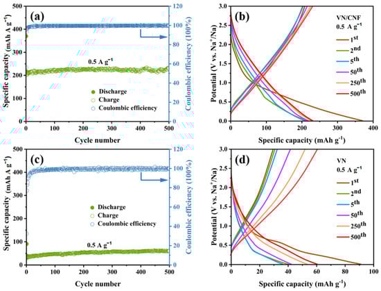 Cycling performance of (a) VN/CNF and (c) VN-based SIB at 0.5 A g−1; GCD curves of (b) VN/CNF and (d) VN anodes at 0.5 A g−1.