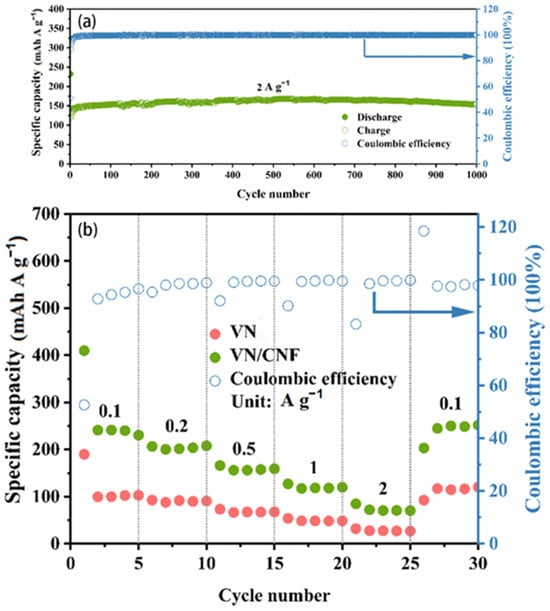 (a) Long-term cycling performance of VN/CNF-based SIB at 2 A g−1. (b) Rate capability of VN/CNF and VN-based SIB.