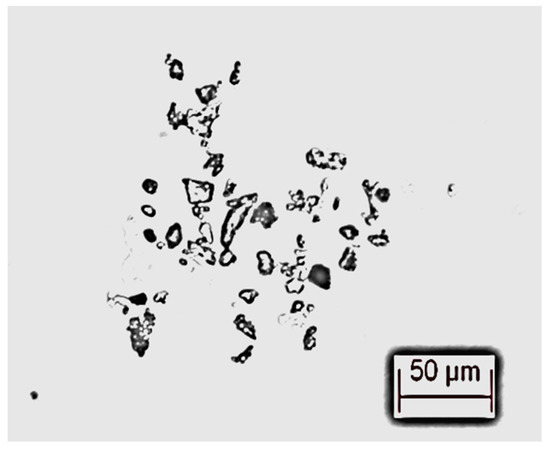 After pretreatment, the transformer oil can be used in the power industry, but there are still impurity particles in the transformer oil (Figure 1 shows a microscopic photograph of impurity particles). These impurity particles are introduced due to the manufacturing process and the use of the transformer oil, and cannot be removed by physical means. Therefore, this paper refers to the pretreated transformer oil as the “Standard-control transformer oil sample”, which is the control group of the test. And the test results of the “Standard-control transformer oil sample” represent the physicochemical properties of industrial transformer oil.