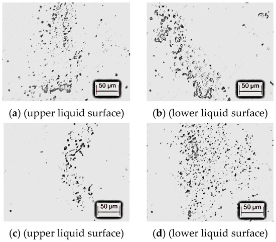 Figure 4. Distribution of impurity particles in the “High-pollution transformer oil sample”. (a) Standing for 8 min. (b) Standing for 8 min. (c) Standing for 15 min. (d) Standing for 15 min.