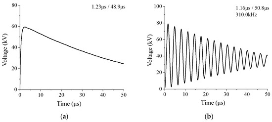 Figure 6. Measured waveform of the laboratory impulse voltage test platform. (a) Measured waveform of standard lightning impulse voltage. (b) Measured waveform of oscillation lightning impulse voltage.