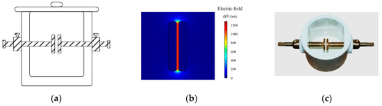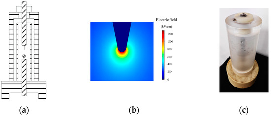 Figure 8. Uneven electric field test container. (a) Structure of the uneven electric field test container. (b) Electric field distribution between the needle-ball electrodes. (c) Photograph of the test container.