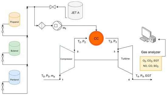 - Mendez, C.J.; Parthasarathy, R.N.; Gollahalli, S.R. Performance and emission characteristics of a small scale gas turbine engine fueled with propanol/jet a blends. In Proceedings of the ASME 2011 International Mechanical Engineering Congress and Exposition, Denver, CO, USA, 11–17 November 2011; Volume 4, pp. 1359–1370. [Google Scholar] [CrossRef]