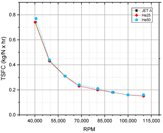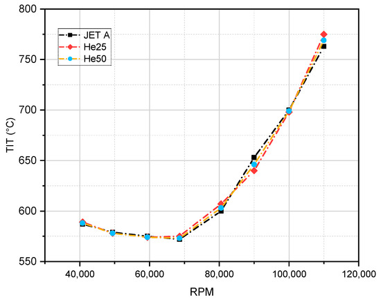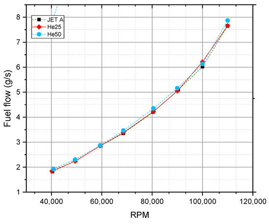 Experimental results were recorded for engine speeds ranging from 40,000 to 110,000 RPM. At each rotational speed, measurements commenced three minutes after achieving thermal stabilization of each combustion chamber sector and establishing steady-state parameters. Each mixture of JET A1 with hexanol was evaluated under the same throttling valve settings as pure JET A, maintaining consistent environmental conditions. The throttling valve was adjusted to allow the engine to reach the desired speed while using the base fuel. Subsequently, aviation kerosene was replaced with fuel blends containing 25% and 50% hexanol by volume. In the notation of fuel blends, each symbol consists of an abbreviation (He—hexanol (C6H13OH)) and a number indicating the volumetric percentage of hexanol in the mixture with JET A. For example, the He25 mixture contains 25% hexanol and 75% JET A. After testing all mixtures at a specific throttle valve setting, the procedure was repeated for the next setting (or engine speed).