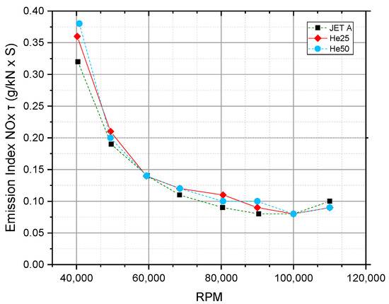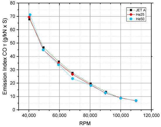 Figure 6 displays the emission index of CO (g/kN·s) as a function of RPM for the fuel types JET A, He25, and He50.