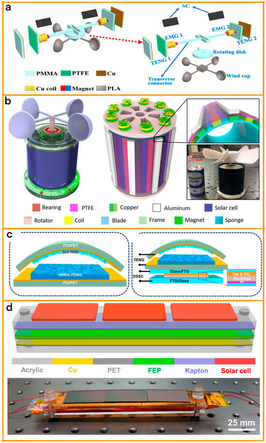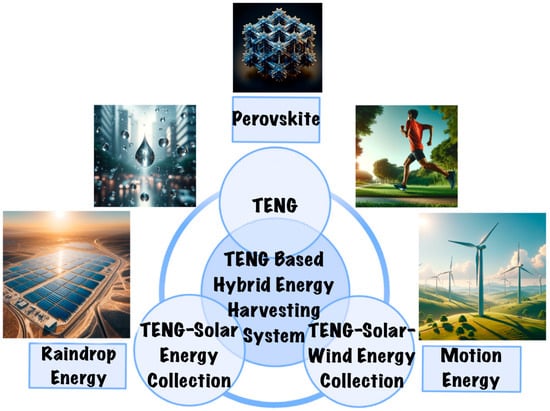 Meanwhile, the concept of multihybrid energy-harvesting devices has emerged as a comprehensive solution to address the limitations of TENG–solar energy systems [52]. These advanced devices are designed to simultaneously collect energy from a diverse array of sources, including wind, bioenergy, solar energy, and even tidal movements (Figure 1) [53,54]. This multifaceted approach allows for the harnessing of energy in various environmental conditions, significantly expanding the scope of application [55,56]. For instance, a multihybrid device can capture solar energy during sunny days, wind energy in breezy conditions, and mechanical energy from human or vehicular movements, ensuring a constant and more reliable energy supply.
