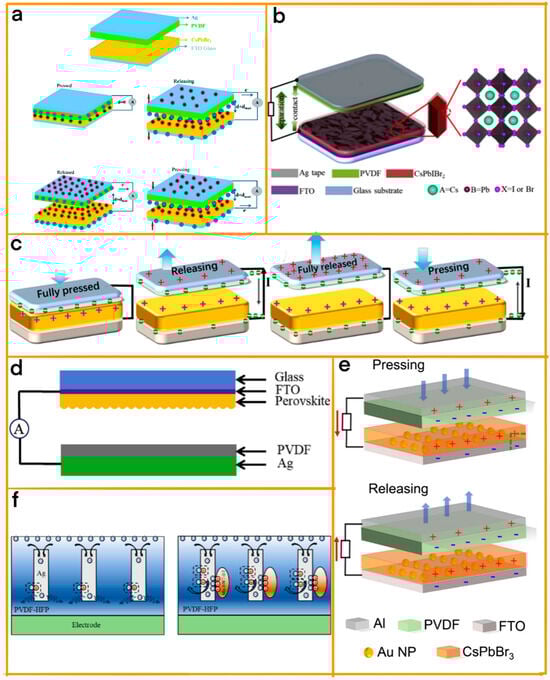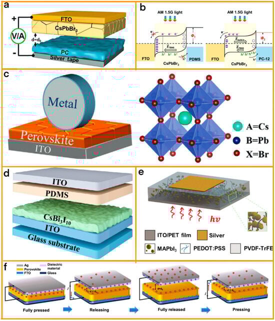 (a) Schematic diagram of the hybrid TENG device and energy level alignment diagrams of the hybrid TENGs with pristine PDMS and (b) PC composite film under friction-illumination working condition. (Wiley-VCH, 2021). (c) Schematic structure of a rolling–mode DCTENG based on metal/perovskite Schottky junction and crystal structure. (Wiley-VCH, 2022). (d) The structure and characterization of a TENG: the schematic structure of the CBI/PDMS TENG. (Elsevier, 2023). (e) Schematic image of a solar cell structure fabricated with the composite thin films. (Elsevier, 2023). (f) Schematic diagram of the vertical contact–separation CsPb1−xMxBr3 perovskite TENG and the working mechanism of a full “press–release” cycle. (Elsevier, 2020).