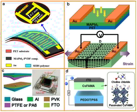 (a) Design of a single–structured multifunctional device and characterization of a MAPbI3-PVDF composite film: Schematic of multifunctional device. (ACS, 2020). (b) Principle of MAPbI3 perovskite photodetectors. (Royal Society of Chemistry, 2020). (c) Schematic structure and an optical image of the PT–/PA–PVK TENG. (Wiley-VCH, 2020). (d) Device structure of PEDOT:PSS–CsFAMA–based DC–TENG and atomic structures of ChCl and CsFAMA. (Elsevier, 2023).