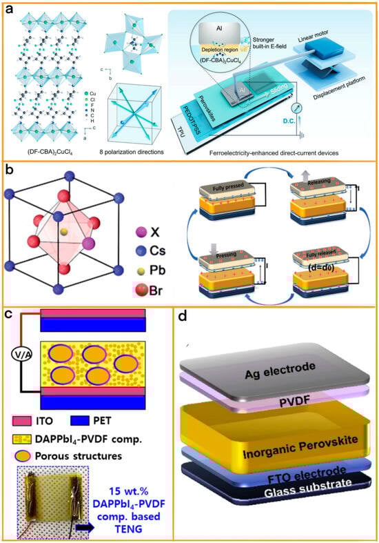 (a) Demonstration of the materials, device structures, experimental setup, and preparation process of a (DF-CBA)2CuCl4-based TVNG device, including side and top views of the crystal structures and eight polarization directions. (Wiley-VCH, 2021). (b) The crystal structure of an inorganic halide perovskite unit and an illustration of charge generation, distribution, and transfer in a press–release cycle. (Royal Society of Chemistry, 2020). (c) Schematic illustration of a fabricated DAPPbI4–PVDF TENG and a photograph of the device. (Elsevier, 2022). (d) Schematic diagram of the “dielectric-on-perovskite” TENG with vertical contact-separation mode. (Elsevier, 2020).