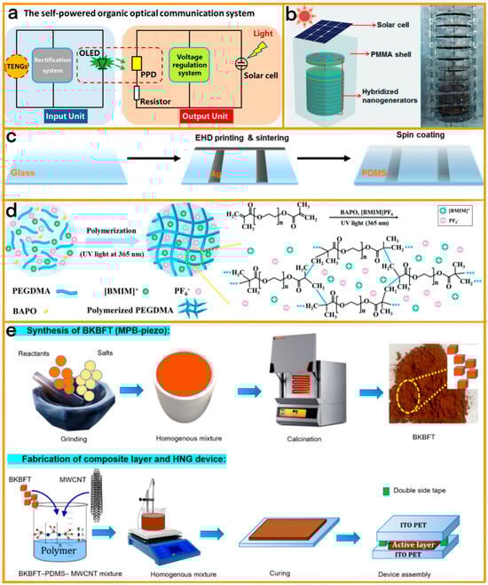 (a) Schematic diagram and photographs of a self-powered optical communication system (SOCS). (Elsevier, 2019). (b) Structure and working principle of the hybridized electromagnetic-TENG. (Springer, 2022). (c) Schematic diagram of the PA–TENG fabrication process. (Elsevier, 2022). (d) Schematic illustration of photopolymerization of PEGDMA with bond breaking and forming details. (Wiley-VCH, 2023). (e) Schematic illustrations of the synthesis of BKBFT via the molten salt method and the preparation and fabrication of the composite film and HNG devices. (ACS, 2023).