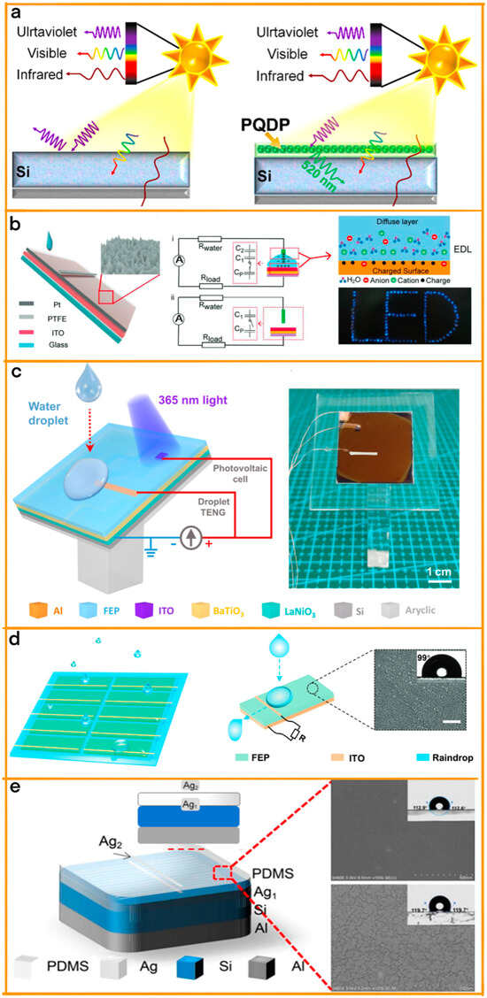 (a) Schematic diagram of the sunlight response to the pristine Si solar cell and the down–conversion mechanism of the PQDP–based solar cell. (Elsevier, 2023). (b) Physical structure and electrical outputs of I–TENG, including the structural diagram, the equivalent working circuit diagram, the electric–double–layer model, and a photograph of the I–TENG lighting up LEDs. (Wiley-VCH). (c) Schematic diagram of the hybridized nanogenerator and optical image of the device. (Elsevier, 2023). (d) Basic principle to design the R–TENG array, including the schematic diagram, the structure diagram of a single unit, an SEM image, and a contact angle photograph of the FEP film. (Wiley-VCH). (e) Schematic diagram for a TENG/Si tandem hybrid solar cell and top–view SEM images. (Elsevier, 2021).