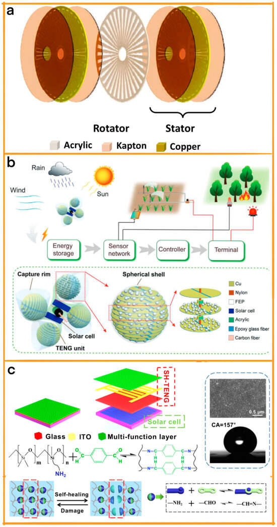 (a) Characterization of the multilayered disk TENG performance and material composition. (Elsevier, 2020). (b) Concept, structure, and working principle of the hybrid all-in-one power source (AoPS) for harvesting environmental energy. (Wiley-VCH). (c) Schematic diagram of the hybrid energy system with the SH-TENG and solar cell, mechanism of self-healing SH-PDMS, chemical structures, SEM image, and contact angle image. (Elsevier, 2021).