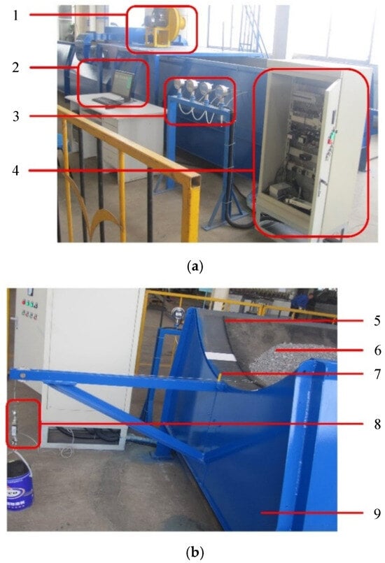 Figure 5. Schematic diagram of test site. 1—centrifugal high pressure fan. 2—control and data comprehensive display system. 3—digital pressure gauge. 4—central control electrical cabinet. 5—conveyor belt. 6—material. 7—tray slot. 8—digital tension meter. 9—air chamber. (a) Control and testing equipment; (b) Air cushion conveyor.