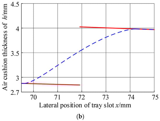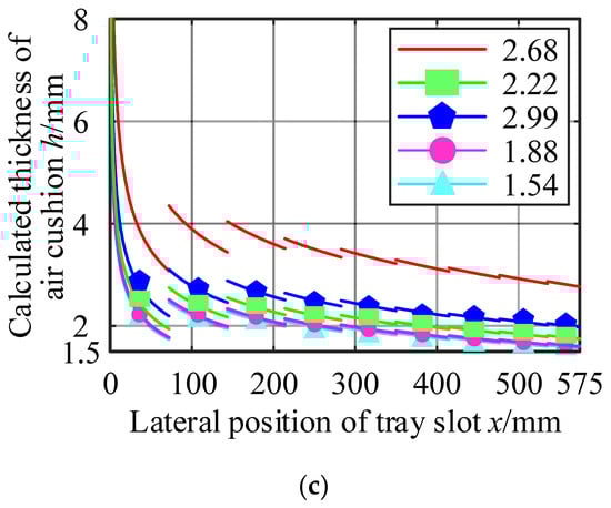 Secondly, the thickness of the air cushion at the lateral center of the tray slot approached infinity. Combining Equation (8) with Figure 6, it could be seen that this was because the lateral change gradient of the air cushion static pressure at this position was 0, and the gas flow rate at this position was considered to be 0.5 times the flow rate of the first exhaust hole, which was a finite value. As a result, the ratio of the two tended to infinity, and the thickness of the air cushion at this position could not be determined.