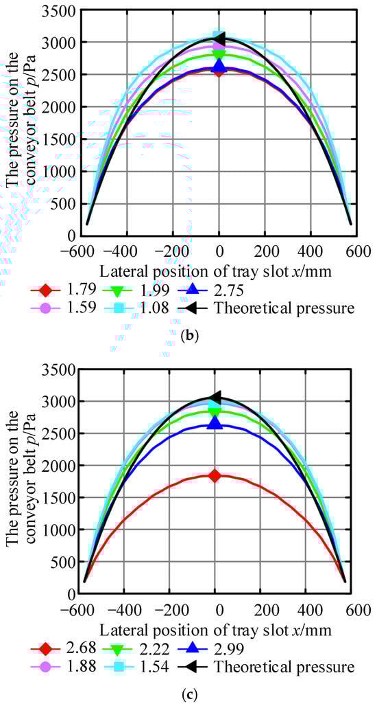 Furthermore, the pressure distribution at the interface between the air cushion and the conveyor belt simulated by Fluent was compared to the theoretical pressure distribution (as shown in Figure 8), and the trend of the two changes showed good consistency.