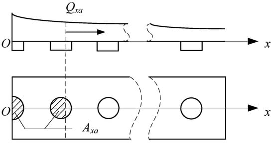 Furthermore, according to the actual working state of the air cushion belt conveyor, the thickness of the air cushion is usually in the millimeter order; that is, the scale in the length and width directions is 10−3–10−4 times the thickness of the air cushion. Therefore, the curvature of the tray slot can be ignored, and the interface between the air cushion flow field and the tray slot can be considered to be a plane. Taking into account the gas flow velocity in the air cushion flow field, the gas flow can be considered to be an incompressible flow. If the load is evenly distributed in the y direction, the air supply parameters do not change with the position in the y direction, and the two do not change with time. Equation (2) can be further simplified as