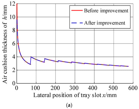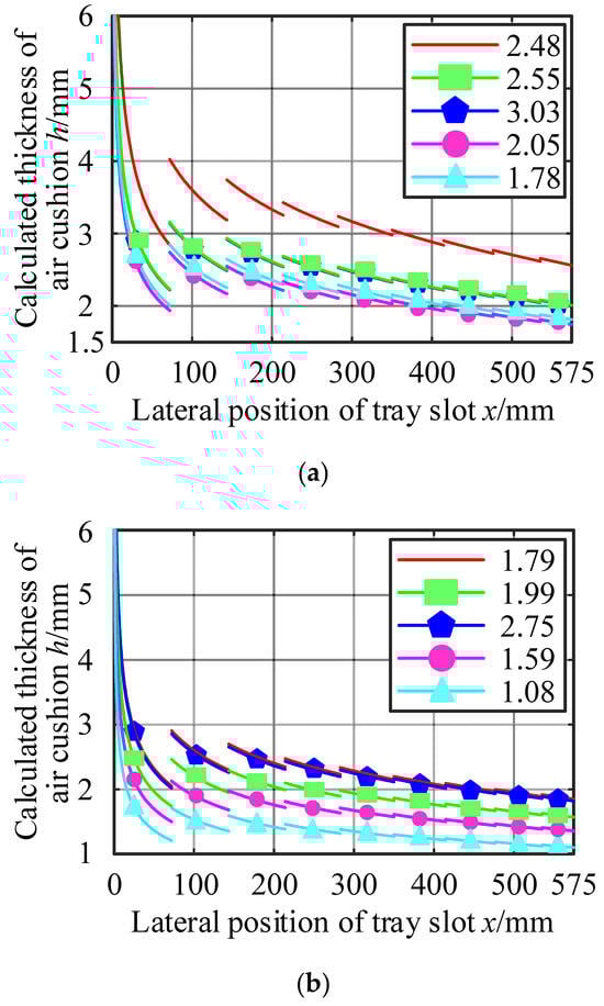 Secondly, the thickness of the air cushion at the lateral center of the tray slot approached infinity. Combining Equation (8) with Figure 6, it could be seen that this was because the lateral change gradient of the air cushion static pressure at this position was 0, and the gas flow rate at this position was considered to be 0.5 times the flow rate of the first exhaust hole, which was a finite value. As a result, the ratio of the two tended to infinity, and the thickness of the air cushion at this position could not be determined.