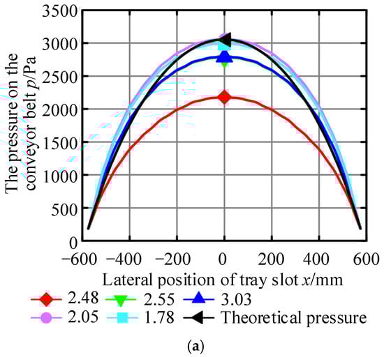 According to the test situation, the air cushion pressure value and pressure distribution of the section carrying the material and the conveyor belt at the same time in the transverse direction can be calculated by Equation (8). The parameter values involved in the equation are shown in Table 4.