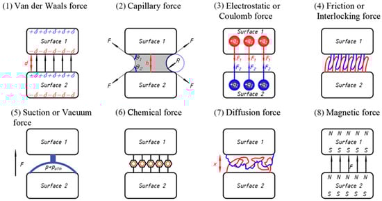 Schematic illustration of the mechanisms of adhesion and the various forces that exist between two surfaces in nature. (1) Van der Waals force; (2) capillary force; (3) electrostatic or coulomb force; (4) friction or interlocking force; (5) suction or vacuum force; (6) chemical force; (7) diffusion force; (8) magnetic force [].