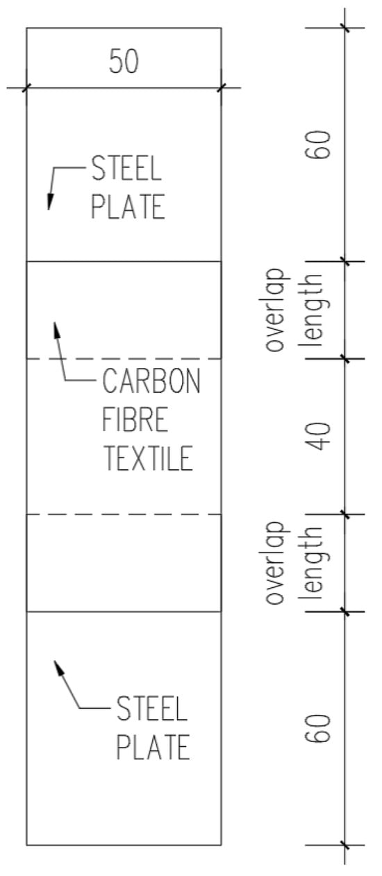 In the first part of the research, a lapped shear laboratory test was performed. The specimens were made from steel plates (2 mm thick) overlapped on one side with SikaWrap 230 C [] carbon fibre textile (CFT) using SikaDur 330 [] adhesive. Both SikaWrap 230 C and SikaDur 330 were provided by Sika Poland sp. z o.o. (Warsaw, Poland). The tests were carried out on 60 specimens, 3 series (A, B, and C) with 20 specimens each. For each series, a different overlap length was considered, namely 15 mm, 25 mm, and 35 mm (Table 1). The samples were produced as shown in Figure 2.