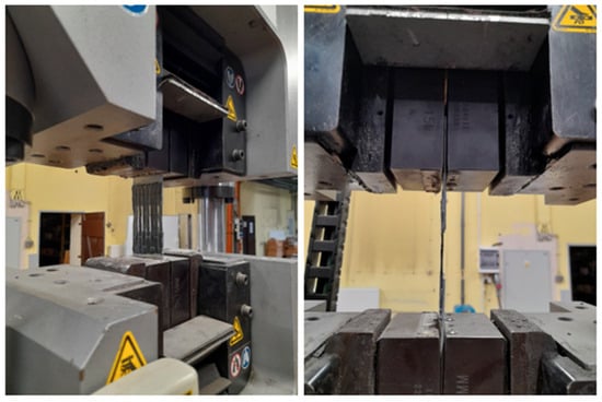 For experimental testing, an INSTRON SATEC 300 DX (Instron Polska, Opole, Poland) testing machine was used. The load accuracy measurement was 0.6 kN and the displacement accuracy was 0.13 mm. The testing machine was set to zero after the test loading system was assembled, but before the specimen was actually gripped at both ends. Once the force zero point was set, the force measurement system was not altered in any way during the test. The tensile tests were carried out under displacement control conditions. The samples were stretched at a speed of 0.01 mm/s until the specimens failed. An example of the prepared specimen in the grips of the testing machine is shown in Figure 3. After the completion of the laboratory tests, an observation of the nature of the fracture for all adhesive SLJs was conducted.