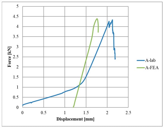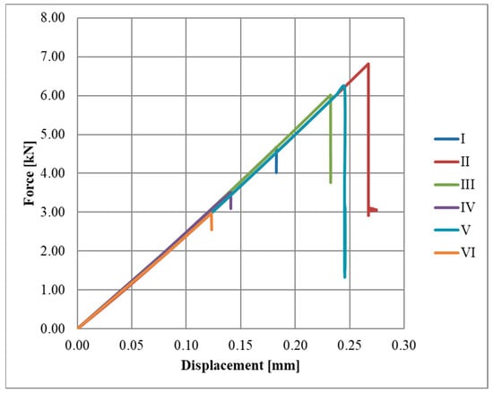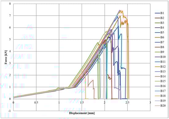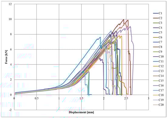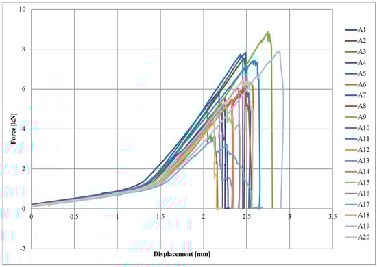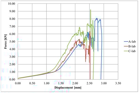 Diagrams of the force–displacement relationships for each series, A, B, and C, are shown in Figure 4, Figure 5 and Figure 6, respectively.