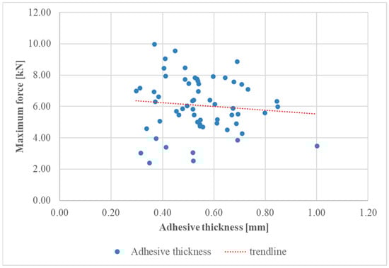 The data points in Figure 7 represent various specimens with differing adhesive thicknesses. The observed trend indicated that greater adhesive thickness resulted in a decreased maximum force capacity. This implies that thicker adhesive layers may compromise joint strength, potentially due to defects within the adhesive.