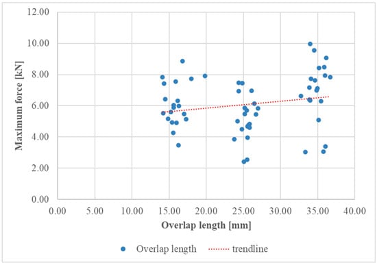 Meanwhile, Figure 8 shows the relationship between the maximum force applied to the specimens and the overlap length of the bonded joints, and the data points represent different series of specimens with varying overlap lengths. The diagram reveals that as the overlap length increased, the maximum force that the joint could withstand also increased. This indicates that a longer overlap length enhanced the strength of the bonded joint, likely due to the larger bonded area distributing the applied load more effectively and reducing stress concentrations.