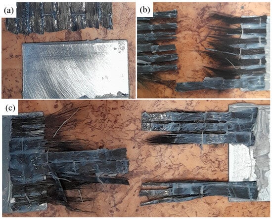 The initial slow increase in force due to the lower initial elastic modulus of the textile can be observed in the graphs. Once a displacement of approximately 1.1–1.5 mm was reached, there was a sudden increase in force, which was a straight line until the specimen broke. The destruction of the joint occurred rapidly or gradually, with successive fragments of CFRP textile breaking off of the steel surface.