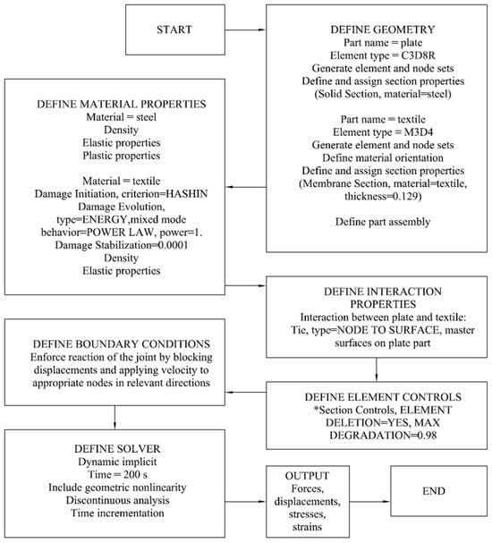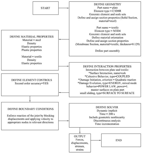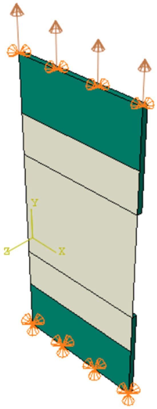 The calculations were conducted using the dynamic implicit procedure, accounting for geometrical nonlinearity and a time period of 200 s. The boundary conditions applied are presented in Figure 14. On the bottom edge, the displacements were all blocked. Similarly, on the top edge, the displacements were blocked, except the vertical displacement. The displacement velocity was set to 0.01 mm/s in order to enforce tension. Tie connection was used between the plate and textile.