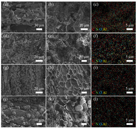 SEM images of the longitudinal sections (a) and cross-sections (b) of AlOC-15/Cellulose, as well as its EDX image (c); SEM images of the longitudinal sections (d) and cross-sections (e) of AlOC-20/Cellulose, along with its EDX image (f); SEM images of the longitudinal sections (g) and cross-sections (h) of AlOC-22/Cellulose, and its EDX image (i); SEM images of the longitudinal sections (j) and cross-sections (k) of AlOC-26-NC/Cellulose, as well as its EDX image (l).