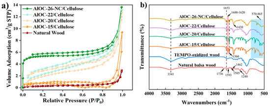 (a) BET analysis of the adsorbents, and (b) FT-IR spectra of natural balsa wood, TEMPO-oxidized wood, and the AlOCs/Cellulose.
