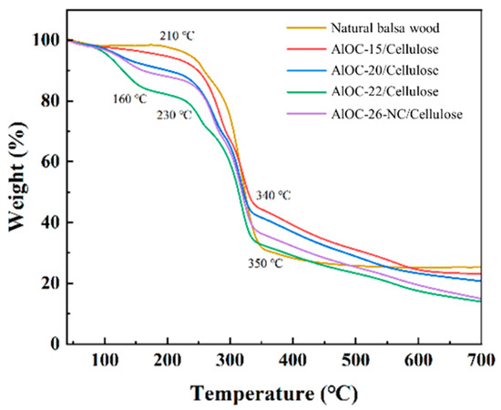 The thermogravimetric curves depicted in Figure 3 reveal the thermal behavior of AlOCs/Cellulose, as well as natural balsa wood. At temperatures below 160 °C, the adsorbent materials exhibited weight loss percentages of 3.96%, 8.54%, 9.85%, and 13.98% for AlOC-15/Cellulose, AlOC-20/Cellulose, AlOC-22/Cellulose, and AlOC-26-NC/Cellulose, respectively. This initial weight loss is primarily attributed to the evaporation of physically adsorbed water [37]. Natural balsa wood underwent a significant weight loss of 66.73% within the temperature range of 210 to 350 °C due to the decomposition of the wood [38]. Furthermore, the adsorbents exhibited notable weight loss behavior in the range of 230 to 340 °C, with the respective weight loss percentages being 46.92% for AlOC-15/Cellulose, 45.56% for AlOC-20/Cellulose, 46.18% for AlOC-22/Cellulose, and 48.76% for AlOC-26-NC/Cellulose, due to thermal decomposition. Between 340 and 700 °C, all adsorbents experienced a weight loss of 18 to 22%, after which the thermogravimetric curves gradually leveled off, indicating a reduction in the rate of decomposition. From these observations, it can be concluded that the incorporation of AlOCs does not significantly affect the thermal stability of the wood.