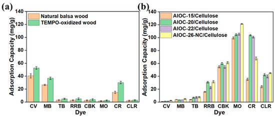 The adsorption effects of (a) natural balsa wood and TEMPO-oxidized wood, and (b) AlOCs/Cellulose (pH 7, m = 10 mg, CV: 204.00 mg/L, MB: 159.93 mg/L, TB: 233.30 mg/L, RRB: 239.51 mg/L, CBK: 293.20 mg/L, MO: 163.67 mg/L, CR: 348.34 mg/L, and CLR: 191.22 mg/L, 298 K, 24 h).
