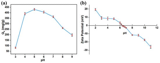 (a) the influence of solution pH on adsorption capacity (m = 10 mg, C0 = 491.00 mg/L, 298 K, 24 h); (b) Zeta potential of adsorbent at different pH.