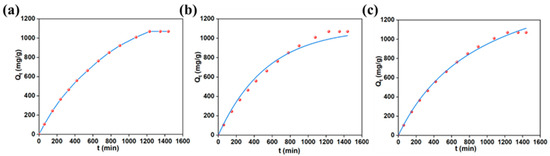 The investigation of the adsorption capacity of MO by AlOC-26-NC/Cellulose at the optimal pH (5), initial concentration (3600.63 mg/L), and temperature (25 °C) over a time range from 0 to 24 h provides insights into the adsorption kinetics. As illustrated in Figure 6a, during the initial 240 min, the slope of the curve is relatively steep, indicating a rapid adsorption rate and a significant increase in adsorption capacity. As contact time increases, the adsorption rate slows down due to the progressive occupation of the adsorbent’s active sites. When the contact time reaches 1230 min, the adsorption rate approaches zero, and the adsorption capacity stabilizes, indicating that saturation has been achieved. Consequently, the optimal contact time for AlOC-26-NC/Cellulose to MO is determined to be 1230 min.