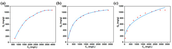The kinetic fitting curves and the actual adsorption volumes were utilized to calculate the mean relative deviation (MRD) [41]. The findings reveal that the MRD for the pseudo-second-order kinetics is 0.0227, while for the pseudo-first-order kinetics, it is 0.0510. Consequently, the pseudo-second-order kinetics model aligns more closely with the observed adsorption behavior of the adsorbent.