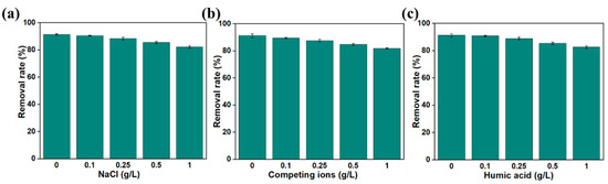 This study investigated how different interference factors impacted the adsorption of MO dye by AlOC-26-NC/Cellulose. Figure 8a illustrates the effect of ion strength by varying NaCl concentration in the MO solution. The findings indicate that as NaCl concentration increases, the dye removal rate declines. Specifically, for AlOC-26-NC/Cellulose, the removal rate was 91.26% at 0 g/L NaCl and dropped to 82.13% at 1 g/L NaCl. This trend is ascribed to two potential mechanisms: (1) increased ionic strength compresses the electrical double layer on the adsorbent’s surface, resulting in electrostatic repulsion between the adsorbent and anionic dye molecules [43]; (2) chloride ions (Cl⁻) compete with anionic dye molecules for adsorption sites, reducing the electrostatic attraction on the adsorbent surface. Their compact size (0.181 nm) gives them an edge in occupying these sites, efficiently displacing dye molecules [44].