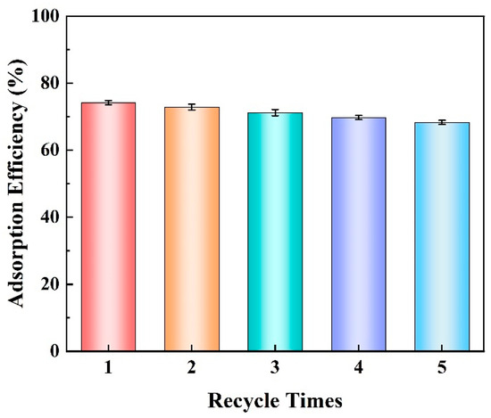 The regenerative capacity and reusability of an adsorbent are critical characteristics that significantly influence its practical applications. To evaluate the recyclability and reusability of the adsorbents, a series of consecutive “adsorption–-desorption” cycling adsorption experiments were conducted. Ethanol molecules containing hydroxyl groups possess polarity that enables them to form hydrogen bonds with methyl orange (MO), thereby exhibiting strong solubility. Consequently, employing ethanol as a desorption solvent is highly effective. As depicted in Figure 9, after five rounds of “adsorption–-desorption,” there is a slight decrease in the removal efficiency of AlOC-26-NC/Cellulose to 75%. This reduction in efficiency is caused by the residual dye within the adsorbent, which may clog the pores and cover some of the active adsorption sites of the adsorbent. Despite this decrease, AlOC-26-NC/Cellulose adsorbent still maintains a relatively high adsorption efficiency, indicating that it possesses good reusability and regenerative properties.