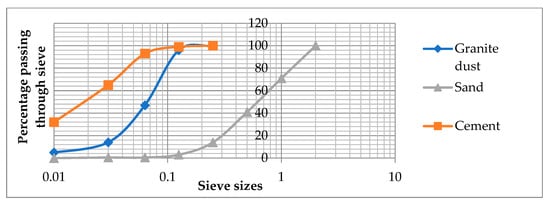 - Granite dust (GD)—waste material obtained during the process of making crushed granite stone (aggregate) at the “Strzegom” quarry, Strzegom, Poland. Physical properties of granite dust are shown in Table 1;
