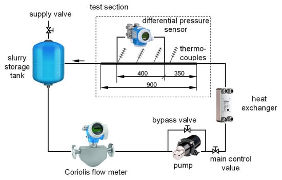 Flow tests of mPCM slurries were carried out using an individually designed and constructed test stand. Its diagram is shown in Figure 1.