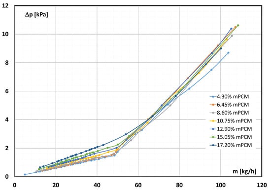 From Figure 2, it can be seen that for each slurry concentration, two different trends of the characteristic course can be distinguished. In the flow rate range up to about m = 50 (kg/h), the points illustrating the pressure drop were arranged along a straight line. The rectilinear course of the characteristic ∆p = f() indicates the laminar flow of the slurry. After exceeding this value, the course of the characteristics changed, which suggests a change like fluid movement. The higher the mPCM concentration, the slightly higher the flow rate at which the characteristic trend changed. A similar relationship can be seen in research work [].