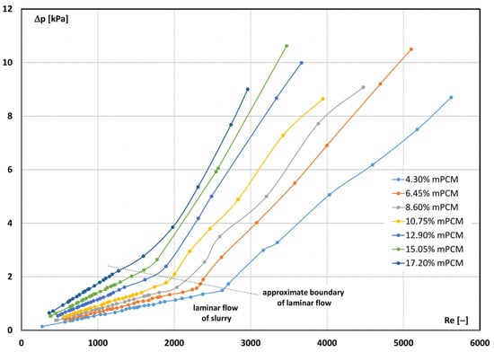 It is noted that with the increase in the concentration of microcapsules, a higher flow rate is required for the laminar flow to start changing into turbulent flow. The reason for such behaviour of the slurry is the increase in its viscosity. The higher the viscosity of the slurry, the lower the value of the Reynolds number corresponding to this flow, according to Formula (5). The authors of study [] drew a similar conclusion. The effect of the Reynolds number on the pressure drop caused by the flow of the mPCM slurry inside the tube with a diameter of d = 4 mm is shown in Figure 3. The Reynolds number was calculated according to relationship (5). The pressure drop was measured on a section of length L = 400 mm during the flow of the slurry at a temperature of T = 7 °C and an mPCM concentration from 4.30% to 17.20%.