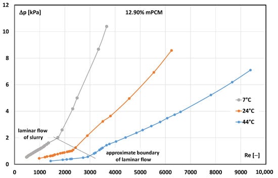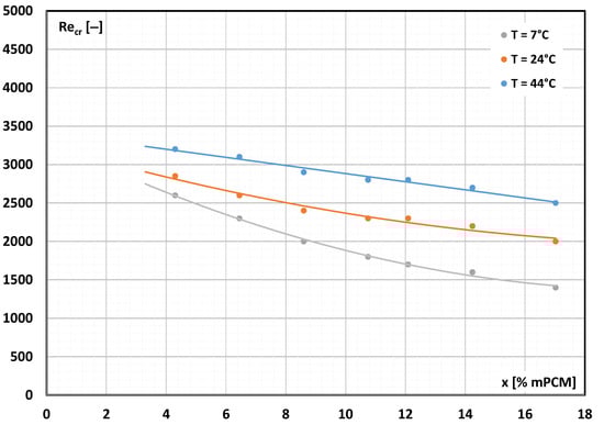 Extrapolation of the experimental results allows us to assume that if water without the addition of mPCM (x = 0% mPCM) were used in the test stand, the critical Reynolds number would be approximately Recr = 3500. This is a higher value than Re 2300, which is considered the engineering criterium for dividing flows into laminar and turbulent. It should be remembered that the value of Re = 2300 is the so-called lower critical Reynolds number. When the fluid flow rate increases, it is possible to maintain laminar fluid flow significantly above this value. It is noted that the increased concentration of the slurry made it more difficult to maintain its laminar flow. Additionally, when the paraffin enclosed in the microcapsule was a solid (T = 7 °C), the transition to turbulent flow occurred at a much lower Recr value than when the paraffin changed its state of matter. The highest values of the critical Reynolds number were obtained when microcapsules filled with liquid paraffin flowed in the liquid. These studies also show that the mPCM slurry changed the nature of the movement before the value of Re = 2300 was reached.