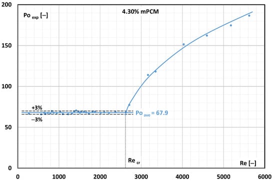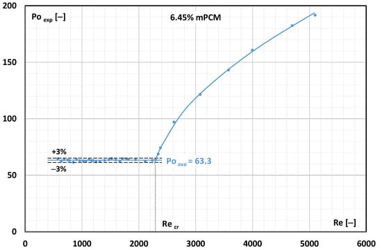 The calculation results presented in Figure 5 refer to experiments performed using a 4.30% mPCM water slurry at a temperature of T = 7 °C. It is known from fluid mechanics that laminar fluid flow occurs as long as the Po number is a constant value. For the presented case, the change in the nature of fluid motion (constant Po number) persisted up to Re = 2600. Hence, it was assumed that for the flow of the mPCM slurry at a concentration of 4.30% and a temperature of T = 7 °C, the critical Reynolds number was Recr = 2600. When the mPCM slurry concentration increased to 6.45%, the critical Reynolds number was already lower and amounted to approximately Recr = 2300 (Figure 6).