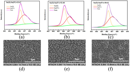 The role of SnF2 in inhibiting the oxidation of Sn2+ was revealed by X-ray photoelectron spectroscopy (XPS). The central peaks observed in the perovskite thin film at 486.3 eV and 487.4 eV corresponded to Sn2+ and Sn4+, respectively. As shown in Figure 2a, the original thin film exhibited a significantly higher proportion of Sn4+ compared to Sn2+, indicating that Sn2+ oxidized after the annealing process (Figure 2a). Upon introducing the reducing agent, tin powder, a slight increase in the Sn2+ content and a relative decrease in the Sn4+ content were observed in the thin film (Figure 2c). When SnF2 and tin powder were simultaneously added, the ratio of Sn2+ to Sn4+ increased from 33:67 in the original thin film to 52:48 (Figure 2b). We conducted surface morphology studies of the perovskite thin films using scanning electron microscopy (SEM). The original perovskite thin film exhibited a higher concentration of aggregated crystalline entities (Figure 2d). When both SnF2 and tin powder were added simultaneously, the distribution of thin film grains appeared more uniform, presenting as island-like structures (Figure 2e). However, films with only tin powder showed uneven crystallization with numerous clusters, potentially leading to non-radiative recombination and thus affecting device performance (Figure 2f) [22]. We demonstrated through atomic force microscopy (AFM) testing that the perovskite film with both tin powder and SnF2 had the best crystallinity and uniformity, with no clustering observed (Figure A2) [23].